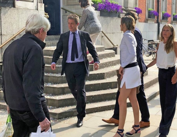 Для торжества Хью Грант выбрал строгий костюм и светлую рубашку, а невеста облачилась в скромную юбку выше колен и приталенную блузу.